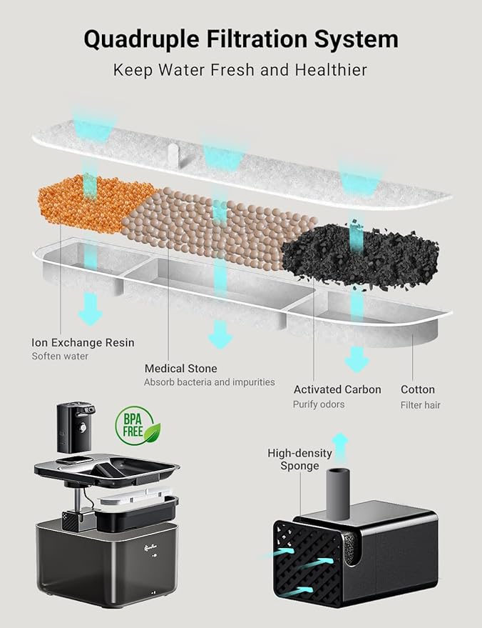- Enjoy Every Sip of Fresh Water - The 5-level filtration system continuously provides fresh and healthy water to your pets. 1.Activated carbon removes bad taste and odor 2.Ion exchange resin could soften the tap water 3.Medical stone removes heavy metals and releases trace elements 4.Non-woven fabric could filter hair and impurities 5.The high-density sponge of pump helps remove fine particles(6-PACK OF FILTERS INCLUDED)