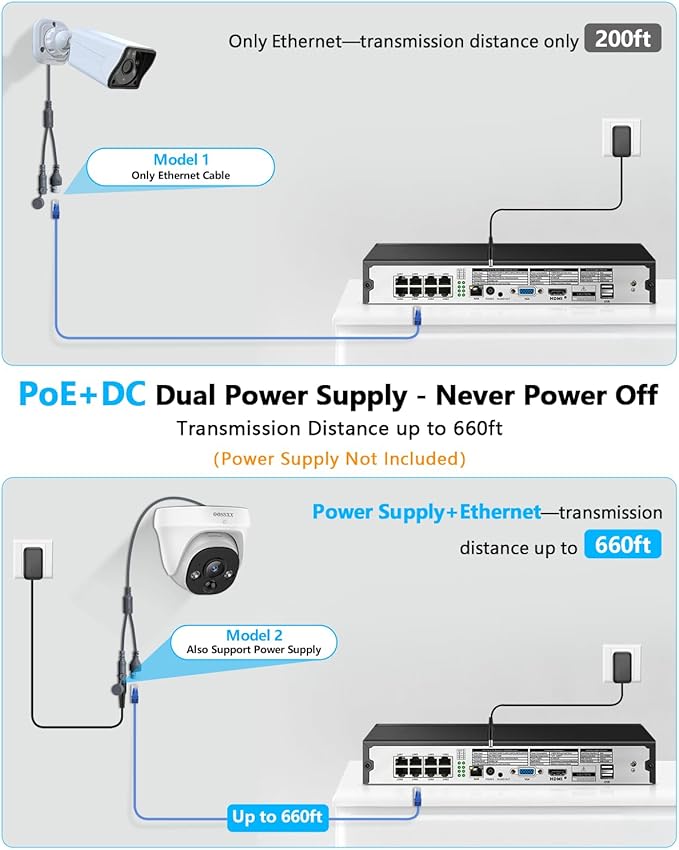 - {Dual Power Supply Choice} OOSSXX PoE camera system offers dual power options: PoE Ethernet and Power Connector. The PoE Ethernet cable supports up to 200 feet (60 meters) of transmission, while the power connector extends the range to 660 feet (200 meters). This dual power setup enhances stability and coverage, making it perfect for extending Ethernet transmission distance.