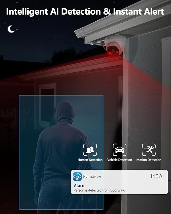 - {2-Way Audio} The security cameras of smart home features a built-in advanced noise-reduction microphone and speaker, enabling clear Two-way Audio. You can talk to family or deter intruders in real time through the app. Just download the free "Honestview" app from the App Store (iOS) or Play Store (Android) on your smartphone.