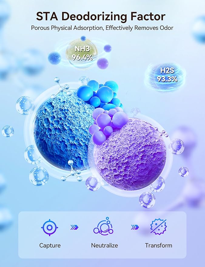 - 【Plant-Based Enzyme Odor Elimination Technology】Compound tea polyphenols and other plant extracts alters the microbial structure of pet waste, reducing activity and synergistically breaking down skatole—the primary source of fecal odor. Enhanced with O2-STA odor-lock technology and zeolite granules, it traps and neutralizes ammonia and stubborn smells, ensuring long-lasting freshness.
