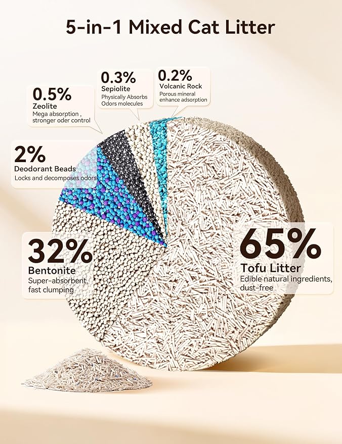 - 【5-in-1 Mixed Cat Litter】Meowant mixed cat litter adopts a scientific ratio, combining 65% tofu cat litter, 32% bentonite cat litter, 2% blue-purple deodorant beads, and adds zeolite, crushed mineral sand to improve stability. Mixed clumping cat litter is ideal for multi-cat households.
