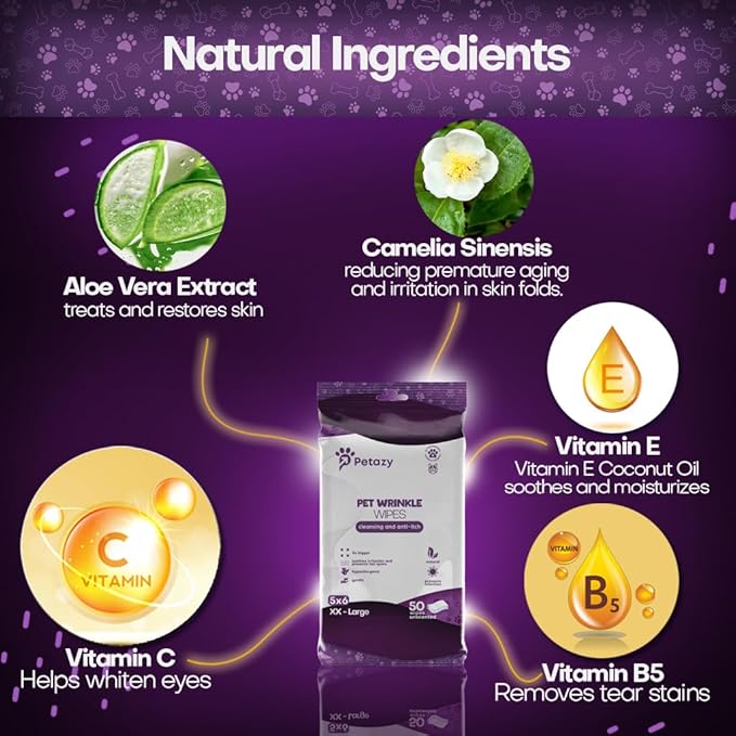 Wrinkle Wipes for Dogs 50 Count | 3X Larger Dog Face Wipes for French Bulldog and Pug - Cleanse Skin Folds, Tear Stains, Tail Pockets | Anti-Itch, Soothing, & Hypoallergenic with Coconut Oil