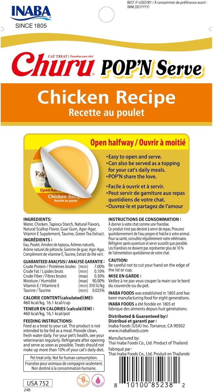 - POP'N SHARE THE LOVE: Churu Pop'N Serve is a unique, perfectly portioned cat treat in a 1.2-ounce cup. Just peel back the easy-to-open lid, pop it into a dish or onto your cat's kibble, and serve the deliciousness