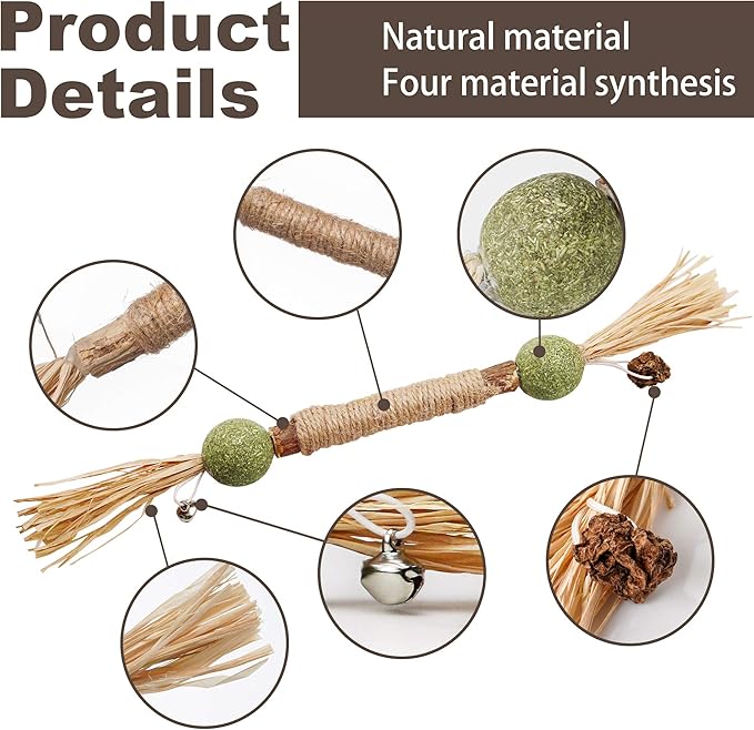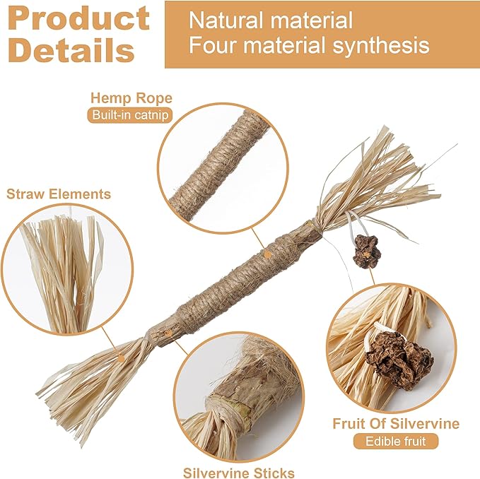 - Silvervine Cat Chew Sticks (Matatabi): Cat teething chew toys are enriched with actinomycin and B-phenylethanol. The scent is very appealing to cats and helps them relieve stress and stay energized and happy. 100% NATURAL: Our Silvervine (Matatabi) Sticks are made from 100% natural silvervine (Matatabi) sticks, raffia fiber, sisal rope and galls (silvervine (Matatabi) fruit) and bells. (Matatabi) fruit) and bells. Feel free to play with them when you give them to your cat, as they are absolutely safe for chewing and biting. This product is made of relatively good materials and other similar products are very different, the quality of the pet to use the assured!