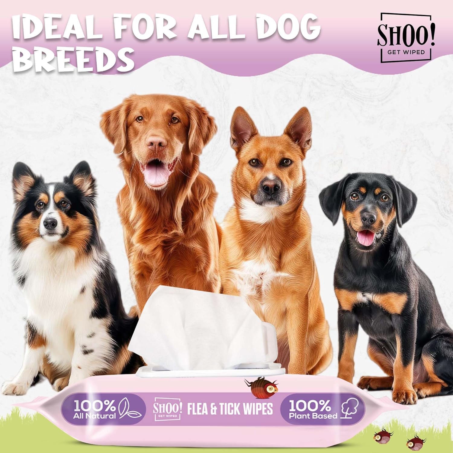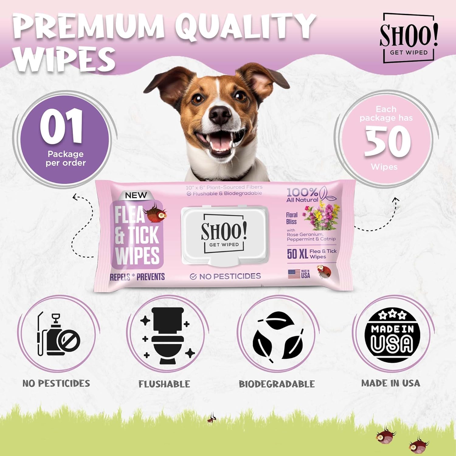 Shoo! Flea & Tick Wipes for Dogs | Convenient, Easy On-The-Go Protection | Plant Based, Natural Oils, Chemical Free | Repels & Prevents | 50 XL Wipes | (Floral Bliss)