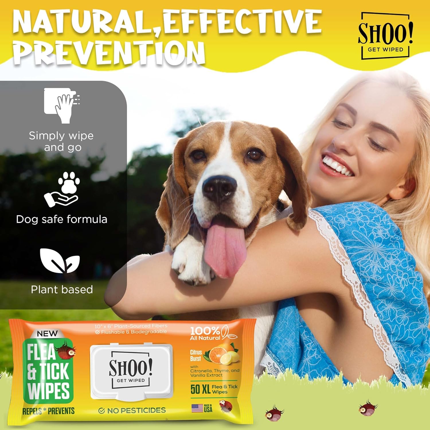 Shoo! Flea & Tick Wipes for Dogs | Convenient, Easy On-The-Go Protection | Plant Based, Natural Oils, Chemical Free | Repels & Prevents | 50 XL Wipes | (Citrus Burst)