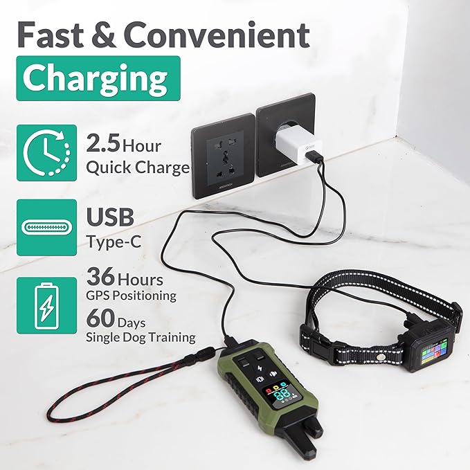- DESIGNED FOR COMFORT, VISIBILITY AND CONVENIENCE – Quick-charging in just 2.5 hours, the GPS electric dog fence collars are waterproof and feature a reflective band for nighttime visibility—ideal for all-weather outdoor yard play or walks.