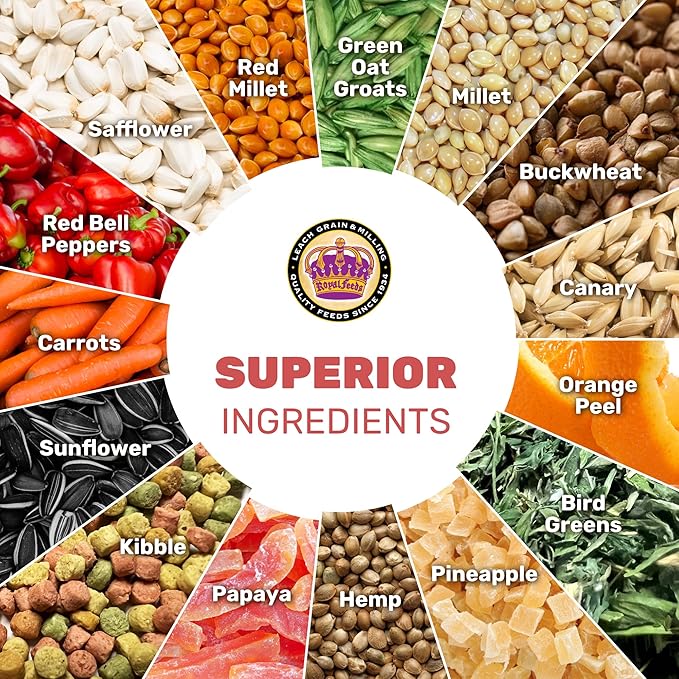 - ππππ ππππ ππππ πππππππππππ β Made with a wholesome mix of top-quality grains, seeds, dried fruits, and vegetables, including canary seeds, millet, sunflower, safflower, papaya, pineapple, red bell peppers, and more. These ingredients closely resemble what birds would eat in the wild, providing them with the variety and nutrition they crave while promoting better digestion, beak strength, and immunity.