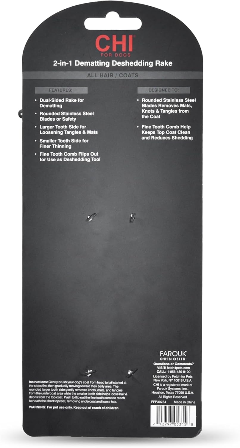 CHI for Dogs 2-in-1 Dematting and Deshedding Rake - Dual-Head Grooming Tool for Mats and Knots - Flip-Out Fine Rake for Smoothing Coats - Large Blade for Thick Fur - Dog Detangler Comb