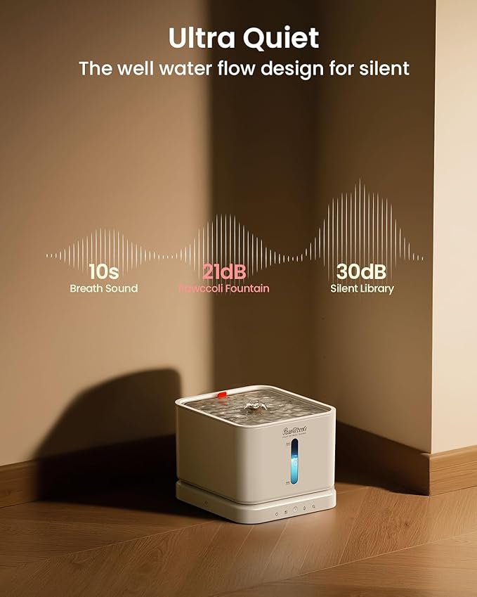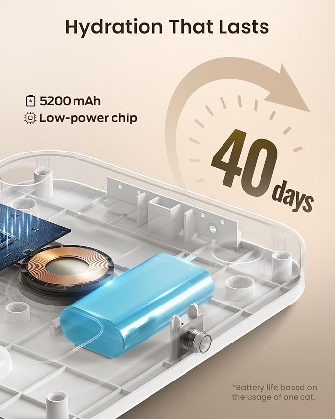 - 11-Day Battery Life - With a 5,200mAh battery capacity, the Pawccoli PureFlow wireless cat water fountain features a built-in rechargeable battery and stainless steel tray, providing a continuous supply of fresh, clean drinking water once fully charged. Even during power outages or short trips, your pet can stay hydrated.