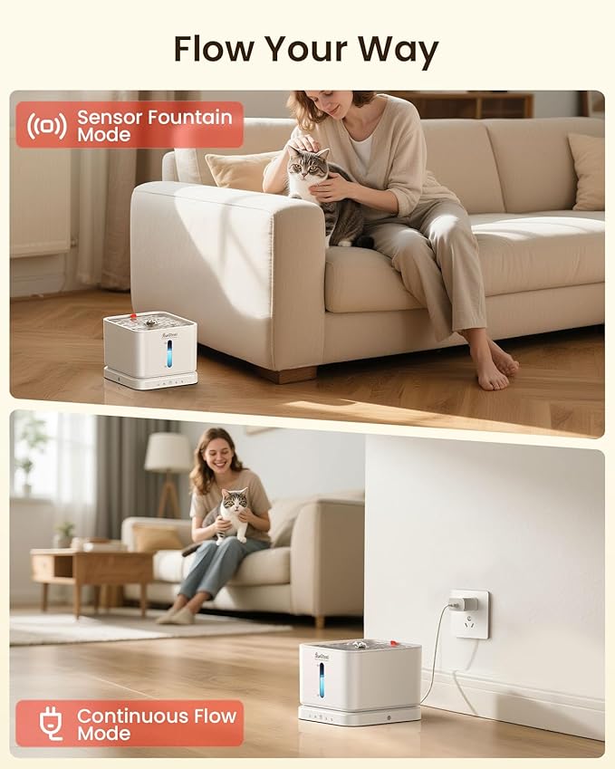 - Dual Water Modes - The cat water fountain now features a sensor fountain mode, equipped with three advanced radar sensors that search for your cat within a 270Β° 80-inch range, ensuring no drinking needs are missed. Additionally, you can use the continuous fountain mode by plugging it in for uninterrupted water supply.