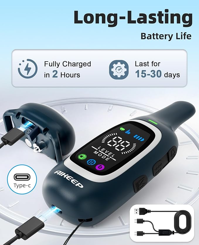 - Fast Charging & Long Battery Life – with a high-capacity rechargeable battery, the dog shock collar receiver lasts 15+ days and the remote lasts 30+ days on a single 2-hour charge.