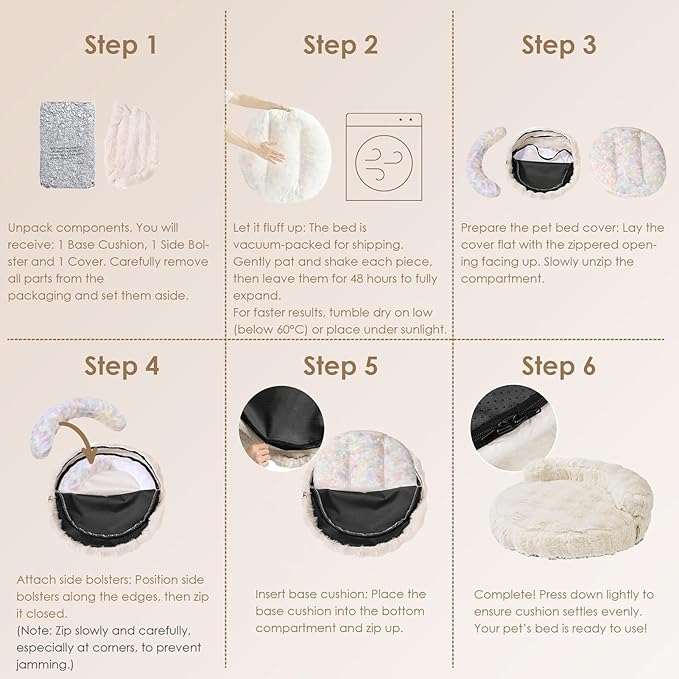- QUICK FLUFF & RECOVERY: This dog bed for small dogs is vacuum-packed for shipping. After opening, simply pat, shake, and let it sit for 48 hours to fully fluff up. For quicker results, tumble dry on low (under 60Β°C), or leave it in the sun.