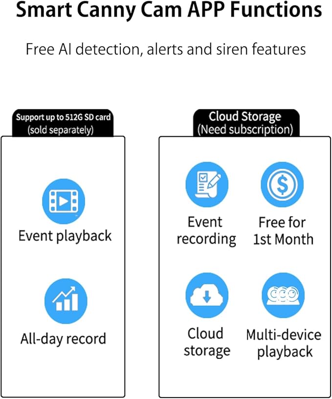 - ๐พ ๐๐จ๐๐-๐๐๐ก๐ ๐ช๐๐๐, ๐๐๐๐ซ๐ ๐ฆ๐จ๐ฃ๐ฃ๐ข๐ฅ๐ง & ๐๐๐๐ซ๐๐๐๐ ๐ฆ๐ง๐ข๐ฅ๐๐๐ โ ๐ฆ๐๐๐จ๐ฅ๐ ๐๐ก๐ ๐ก๐ข ๐ ๐ข๐ก๐ง๐๐๐ฌ ๐๐๐๐ฆ: Connect via 2.4GHz/5GHz WiFi, control hands-free with Alexa, and store video locally via SD card (up to 512GB) or on the cloud (1-month free trial). Whether you're using it as a indoor cam, pet cam or baby cam, you can enjoy full AI detection, alarm features, and more โ all with no subscription. Fully compatible with the upgraded "Canny Cam" app