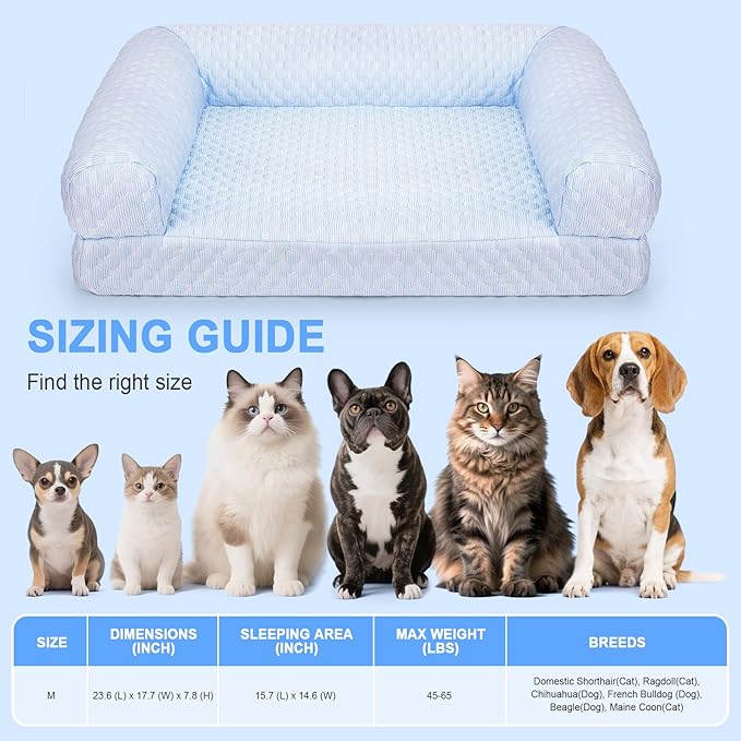 - Perfect for Medium Pets (Up to 65 lbs) – Measuring 23.6" L x 17.7" W x 7.8" H, this cooling dog & cat bed is ideal for breeds like Chihuahuas, French Bulldogs, Beagles, Domestic Shorthairs, Ragdolls, and Maine Coons. The sofa-style raised edges provide neck and head support while keeping them relaxed.