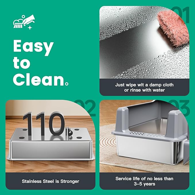 - EXPENSIVE! BUT WORTH IT! - The Suitfeel extra large stainless steel litter box for cats is made of thick stainless steel metal that LASTS UP TO 5 YEARS, so you won't need to replace the steel cat litter box as your kitten grows. The XL cat litter box stainless steel also has no residual stains, no smell, a non-stick bottom, non-rusting, and easy-to-clean features it is a worthwhile investment in the long run!