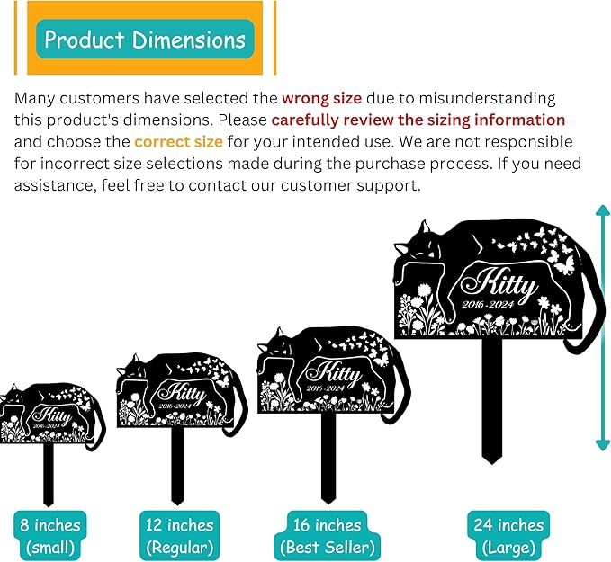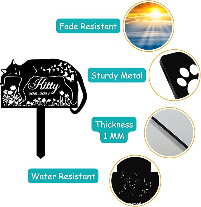- Durable, Rust-Proof & Fade-Resistant – Our powder-coated metal grave marker is built to endure sun, rain, snow, and wind—keeping your cat’s memory safe and visible season after season.