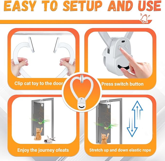 - Cat Doorway Toy Complete Set –Cat toys for doorway ready to Play Right Out of the Box Includes: ✅ 2x Flying bird Toy for Cats(attracts cats with realistic motion) ✅2x Mouse cat toy✅2x Tail cat toy✅ 2x Elastic Strings (adjustable length for different play styles) ✅ 1x USB Charging Cable (convenient rechargeable) ✅ 1x Color Box + User Manual (easy setup)Enrichment for indoor cats perfect for keeping cats entertained automatic cat toy doorway.