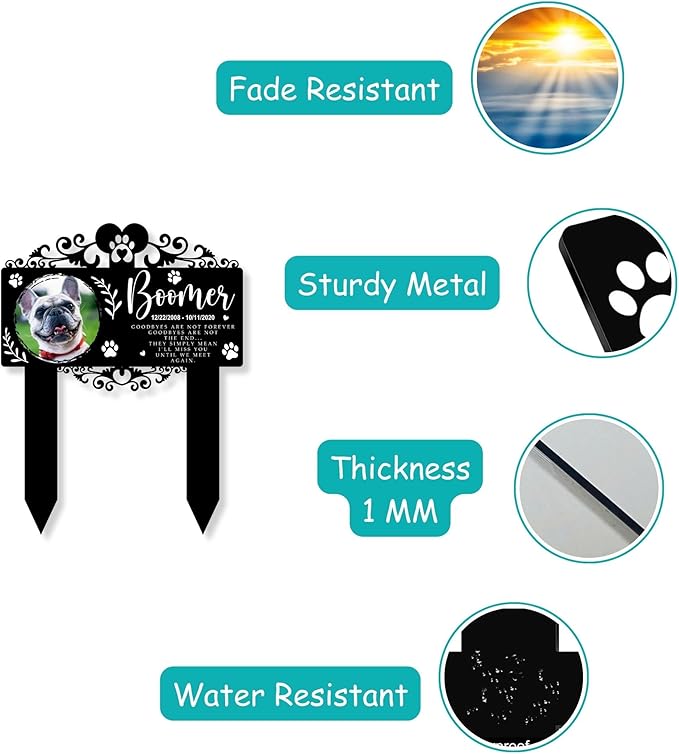- DURABLE PET MEMORIALS: Crafted from durable metal, these pet grave markers are designed to resist rust, withstand harsh weather, and prevent fading, ensuring a lasting memorial for your cherished pet.