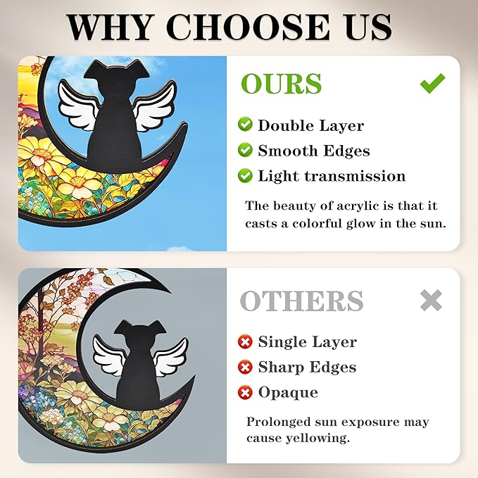 - Double layer design: Made of acrylic and sturdy wood, size is 5.4" X 5.1", thickness is 0.32". this dog memorial gift glows colorfully when the sun shines through it, unlike other suncatchers that only have a single layer and are opaque. this dog memorial suncatcher is perfect for windows, gardens, patio, backyard, porch, etc.