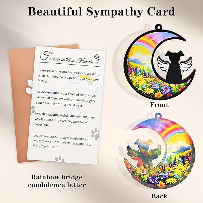 - The Dog Passing Away Gifts: Contains: Each dog memorial suncatcher is packed in a thickened kraft paper box to ensure safe delivery. It includes 1 suncatcher, 1 chain, 1 hook, 1 pen, and 1 card (with rainbow bridge condolence letter for loss of dog)