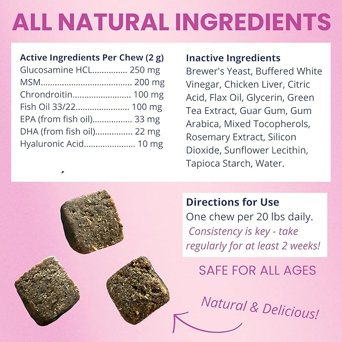 - Wholesome Ingredients Dogs Love to Eat: Made with real Chicken Liver and absolutely no artificial flavors, colors, fillers, or sweeteners, this dog hip and joint supplement offers both taste and function. The square-shaped chews make daily supplementation easy, delicious, and stress-free for dogs of all sizes.