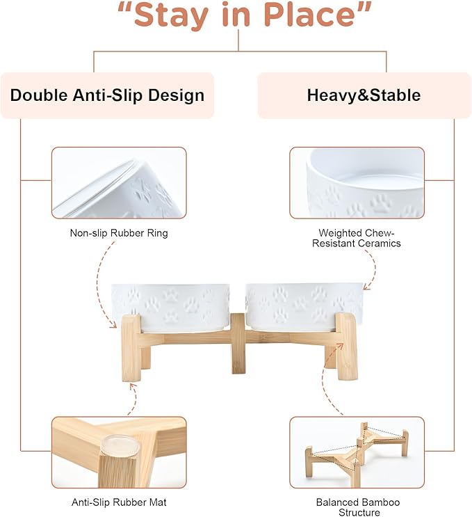 - Stable, Tip‑Resistant Design – A solid bamboo frame with Chew‑Resistant Heavyweight Ceramic, wide stance, and slip‑proof silicone pads join forces to create raised dog bowls that STAY IN PLACE on tile, wood, or laminate. Fewer spills mean cleaner floors and no accidental gouges or scratches or noisy