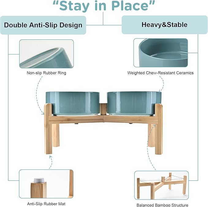 - Stable, Tip‑Resistant Design – A solid bamboo frame with Chew‑Resistant Heavyweight Ceramic, wide stance, and slip‑proof silicone pads join forces to create raised dog bowls that STAY IN PLACE on tile, wood, or laminate. Fewer spills mean cleaner floors and no accidental gouges or scratches or noisy