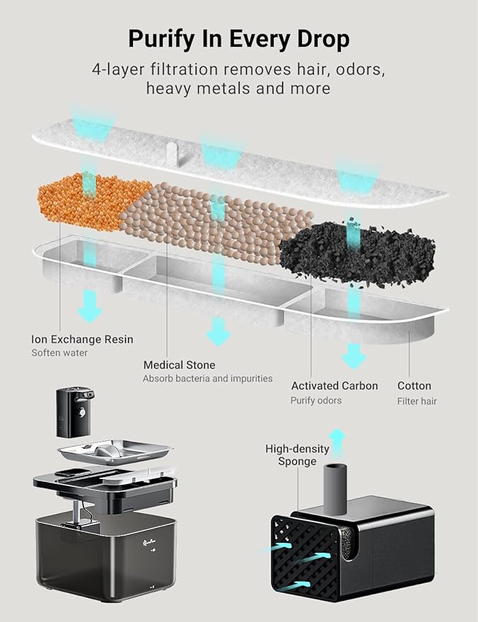 - Enjoy Every Sip of Fresh Water - The 5-level filtration system continuously provides fresh and healthy water to your pets. 1.Activated carbon removes bad taste and odor 2.Ion exchange resin could soften the tap water 3.Medical stone removes heavy metals and releases trace elements 4.Non-woven fabric could filter hair and impurities 5.The high-density sponge of pump helps remove fine particles