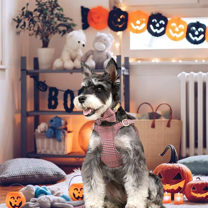 - Dog Harness Collar & Leash : One set include all will meet all your needs! Cute classic plaid dog harness come with a pet leash and a pet collar. Wearing chic set for both male and female dogs on a Wedding,New Year,Birthday & Holiday Gifts,Party Costume,Christmas,Photo Shot and Family Picnic will make your dog looks very charming and fashionable