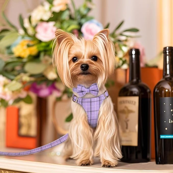 Beirui Cute Extra Small Dog Harness Collar and Leash Set with Bowtie, Soft Adjustable Plaid Puppy Harness for Small Sized Dogs Cats Walks Parties and Photoshoots(Purple,XXS:Chest 12-14")