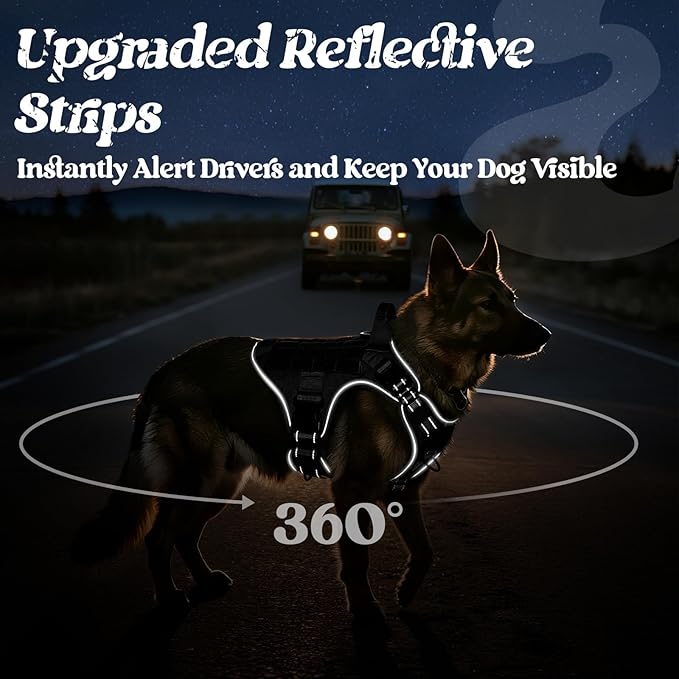 - 360° Reflective Safety: Upgraded with 360° reflective safety stitching, this tactical harness ensures maximum visibility in low-light conditions. Protect your dog during night walks, dawn patrols, and wilderness hikes.
