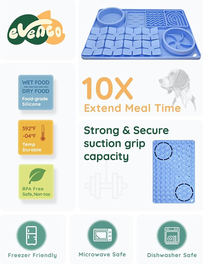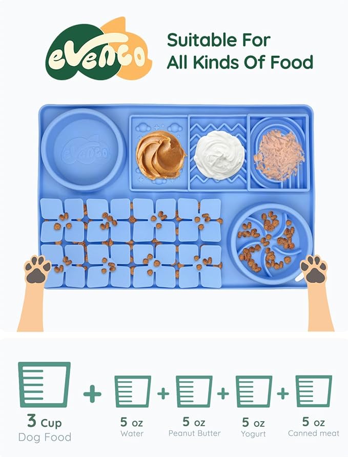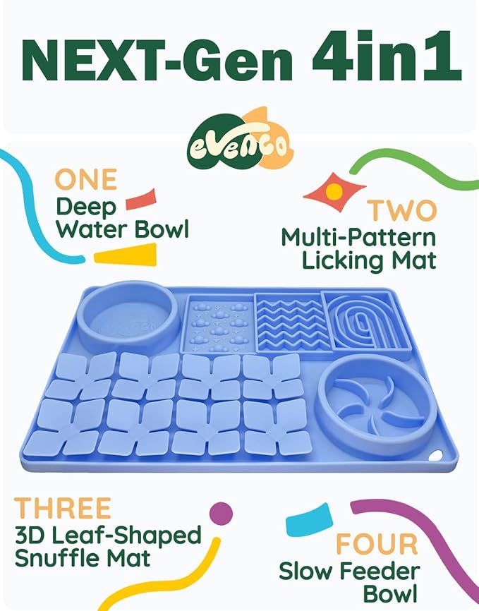 - UPGRADED 4-IN-1 FEEDER: Our multifunctional slow dog feeder includes a slow-eating bowl, a dry food bowl, a snuffle area for mental stimulation, and a lick mat with 3 patterns. Ideal for enhancing the lives of dogs and cats, and a thoughtful gift for a multi-pet family.