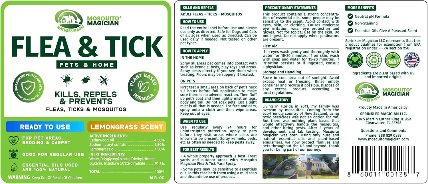 Mosquito Magician Indoor and Outdoor Spray - Use for Carpet, Furniture, Bedding, Couches & Pets – Plant-Sourced with Essential Oil - Lemongrass, 16 OZ
