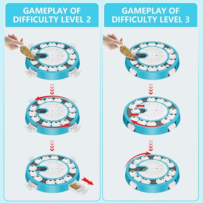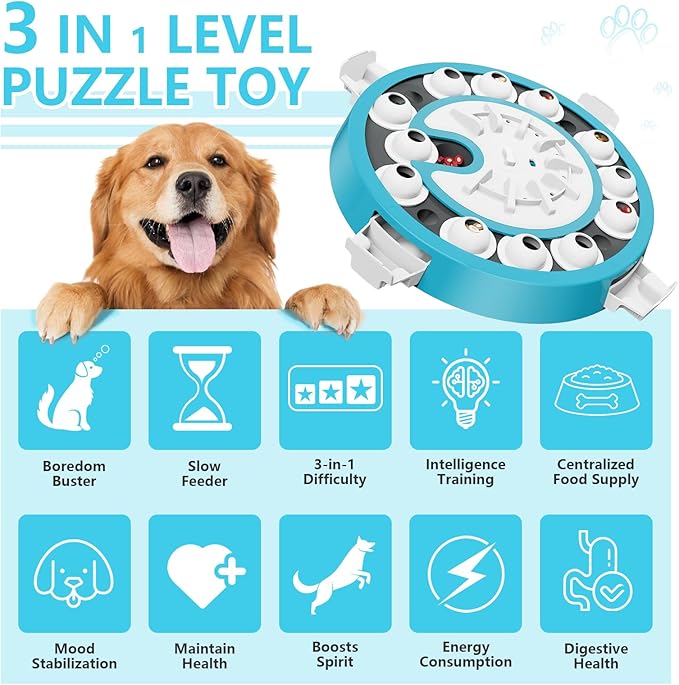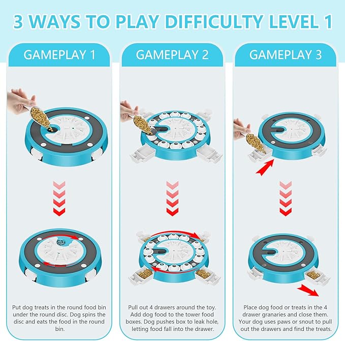 - 3 in 1 Upgraded Dog Puzzle Toy: The interactive dog toy combines 3 difficulty levels into 1 toy. Level 1 offers three distinct gameplays. In addition, there are Level 2 and Level 3 challenges. The cognitive dog toy is perfect for dogs of all skill levels, with easy, medium, and advanced modes—great for puppies, seniors, or smart dogs craving mental stimulation. As your dog masters each level, they'll gradually unlock complex dog puzzles to suit their evolving problem-solving abilities