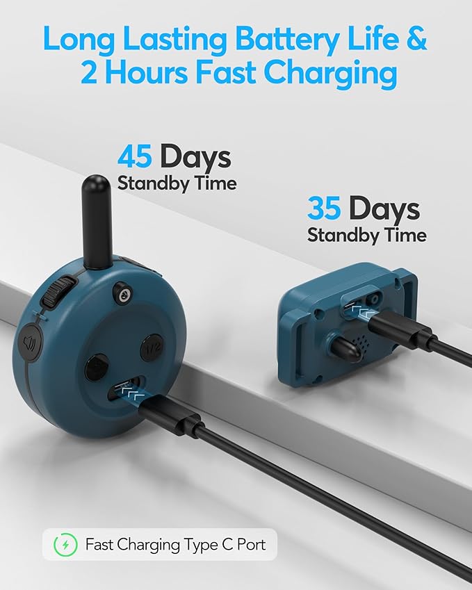 - 【Incredible Battery Life & Quick Charging】No worries about replacing the batteries. This dog training collar can be charged using 2-in-1 Type C within 2 hours & the collar holds a charge for up to 35 days of standby time and the remote 45 days!