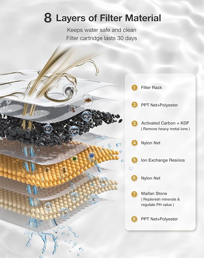 - Flowing Freshness, 8-Layer Purity: This advanced cat water fountain features an 8-layer filtration system including KDF, ion exchange resin, ceramic balls, and activated carbon—removing impurities and softening water for healthier hydration. The filter lasts 30–60 days depending on flow mode. Get timely filter reminders via the petgugu app—or simply use the pet water fountain without app control