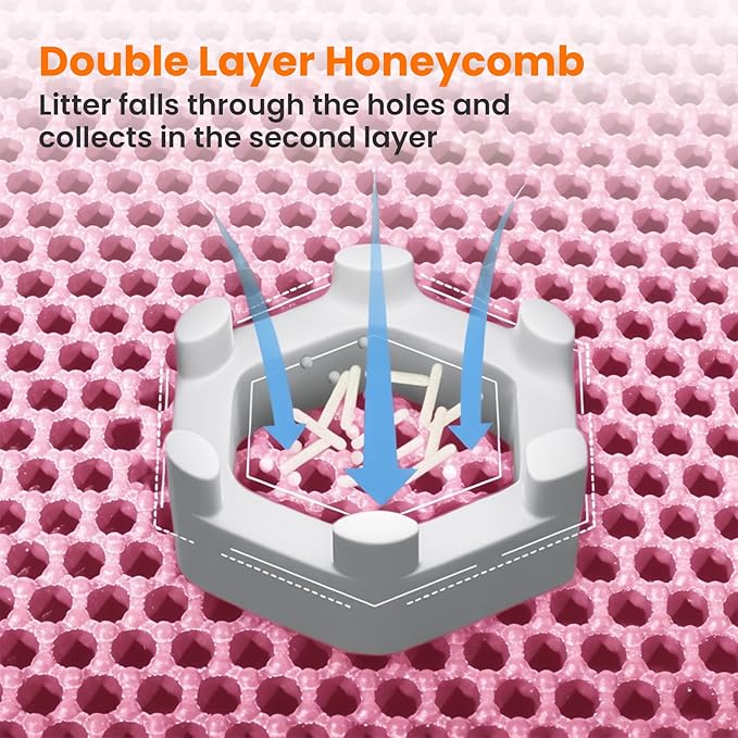 - Double Layer Honeycomb Structure: The top layer with holes captures all types of litter including crystal, clay, tofu and more, letting it fall into the waterproof bottom layer for easy cleanup. Simply pick up the litter catcher mat, pour the litter back into the box and reuse it. This smart design reduces litter waste and simplifies your daily cleaning, making it an essential cat supply.