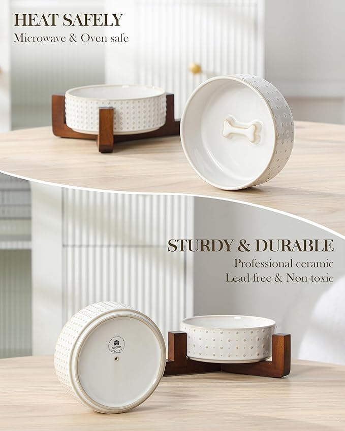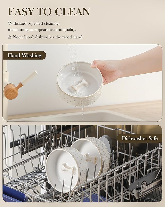 - š¦“ćEASY MAINTENANCEćThe ceramic bowls can be easily removed from the wooden stand for quick cleaning and convenient refilling. Featuring an active glaze finish, they are dishwasher safe and easy to clean by hand. Microwave safe as well, these bowls allow you to warm up your pet's food whenever needed.
