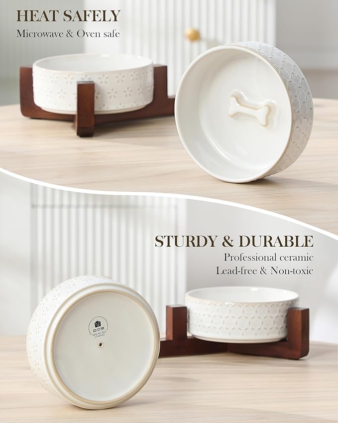 - š¦“ćELEGANT DESIGNćFeaturing embossed Five-leaf Grass and Honeycomb patterns, paired with a stylish walnut wood stand for elevated dining. These ceramic dog bowls combines classic and modern styles to enhance its visual appeal. The cleverly designed dog bone-shaped decoration at the bottom adds both beauty and fun.
