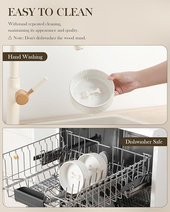 - š¦“ćEASY MAINTENANCEćThe ceramic bowls can be easily removed from the wooden stand for quick cleaning and convenient refilling. Featuring an active glaze finish, they are dishwasher safe and easy to clean by hand. Microwave safe as well, these bowls allow you to warm up your pet's food whenever needed.