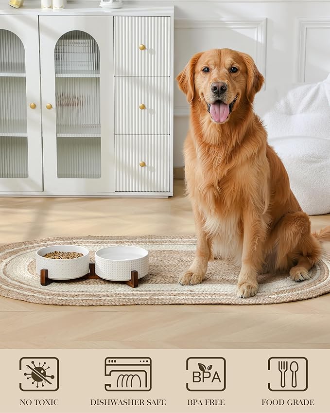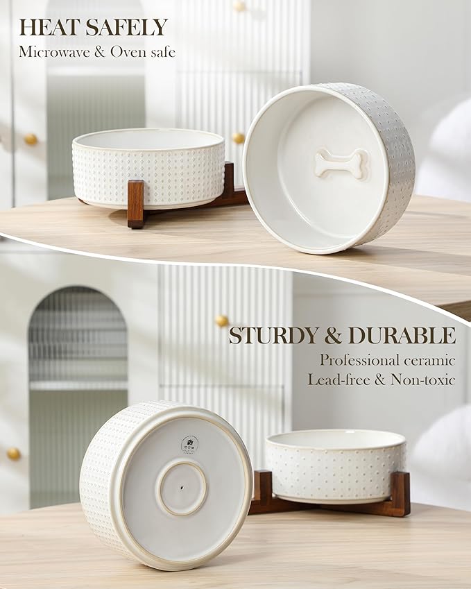 - š¦“ćELEGANT DESIGNćFeaturing embossed Rhombic and Polka Dots patterns, paired with a stylish walnut wood stand for elevated dining. These ceramic dog bowls combines classic and modern styles to enhance its visual appeal. The cleverly designed dog bone-shaped decoration at the bottom adds both beauty and fun.