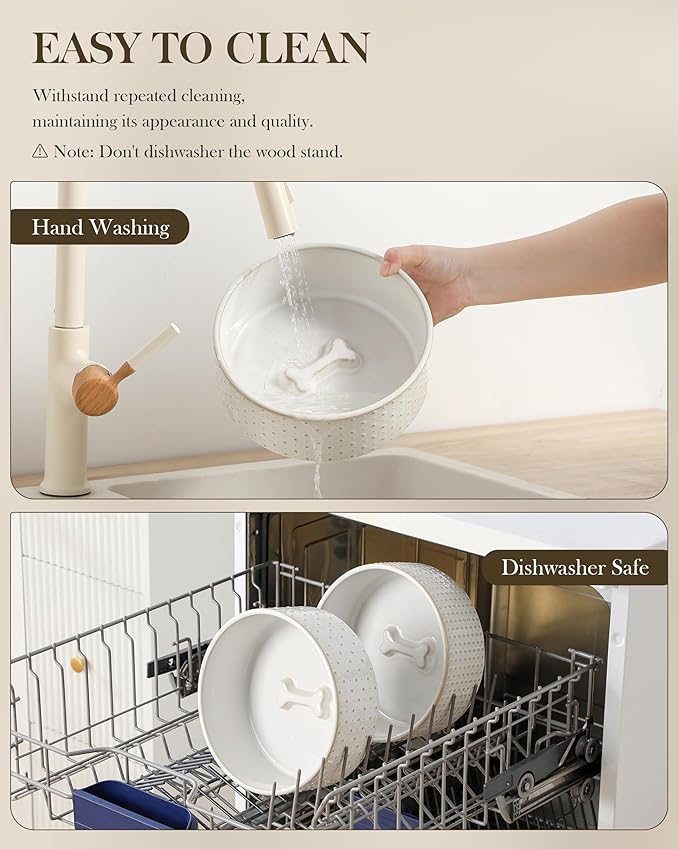 - š¦“ćEASY MAINTENANCEćThe ceramic bowls can be easily removed from the wooden stand for quick cleaning and convenient refilling. Featuring an active glaze finish, they are dishwasher safe and easy to clean by hand. Microwave safe as well, these bowls allow you to warm up your pet's food whenever needed.