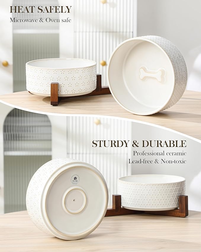 - š¦“ćELEGANT DESIGNćFeaturing embossed Five-leaf Grass and Honeycomb patterns, paired with a stylish walnut wood stand for elevated dining. These ceramic dog bowls combines classic and modern styles to enhance its visual appeal. The cleverly designed dog bone-shaped decoration at the bottom adds both beauty and fun.