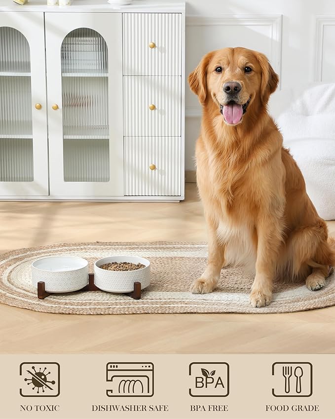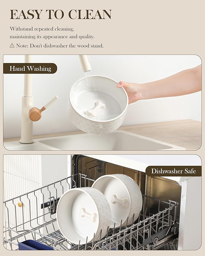 - š¦“ćEASY MAINTENANCEćThe ceramic bowls can be easily removed from the wooden stand for quick cleaning and convenient refilling. Featuring an active glaze finish, they are dishwasher safe and easy to clean by hand. Microwave safe as well, these bowls allow you to warm up your pet's food whenever needed.