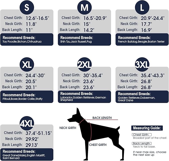 - 4XL Dog Cold Weather Coats:Size XXXX-LARGE, fits 37.4"-51.15'' chest,29.13" back, 29.92''neck;Dog winter jacket for big dogs like Boxer,Great Dane,Rottweiler,Doberman etc.Pls measure your dog's size carefully before ordering