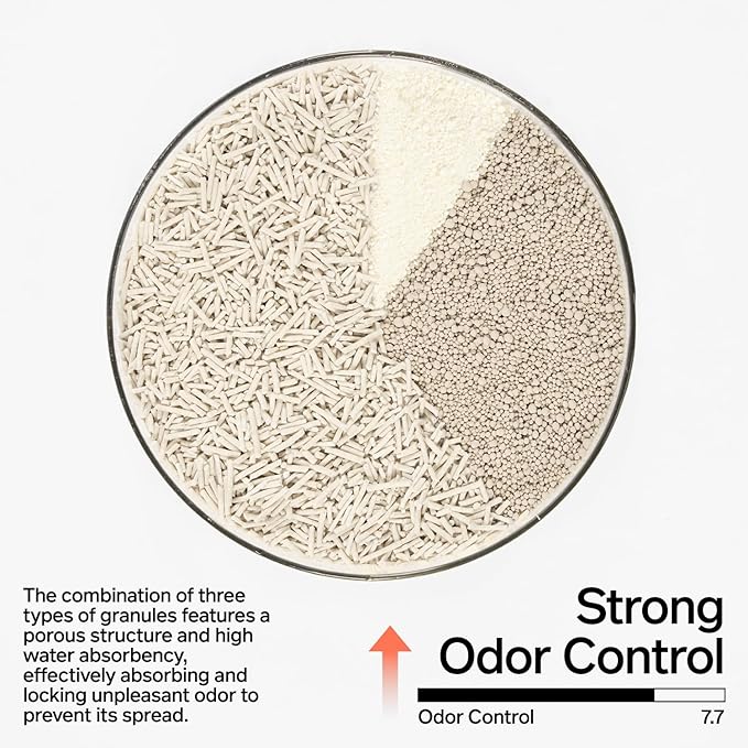 - 【Odor Control 7.7】Strong Odor Control:The combination of three types of granules features a porous structure and high water absorbency, effectively absorbing and locking unpleasant odor to prevent its spread.