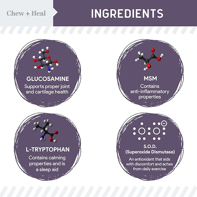 - Our chewable glucosamine for dogs contains natural anti-inflammatory properties that can help reduce joint discomfort and increase mobility. Combined with MSM, it may also improve lubrication in your dog's joints.