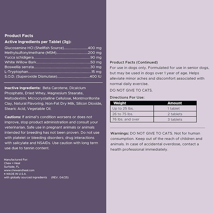 - Chew + Heal's mobility and vitality tablets for senior dogs contain ingredients like glucosamine, MSM, and more to support hip and joint health and relieve aches and pains.
