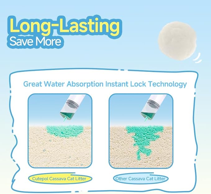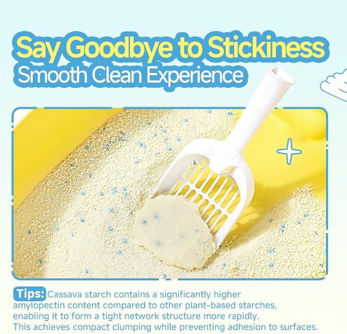 - 【Plant-Based Ingredients】Made from 94% Cassava, 5% Baking Soda, and 1% Deodorizing Granules for an eco-friendly and safe litter choice. We highly recommend that you mix our cassava cat litter with the cat litter you are currently using to enhance the effects of clumping, water absorption, and non-sticking to the bottom.